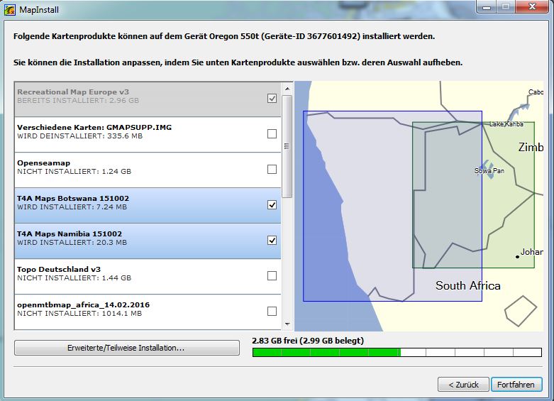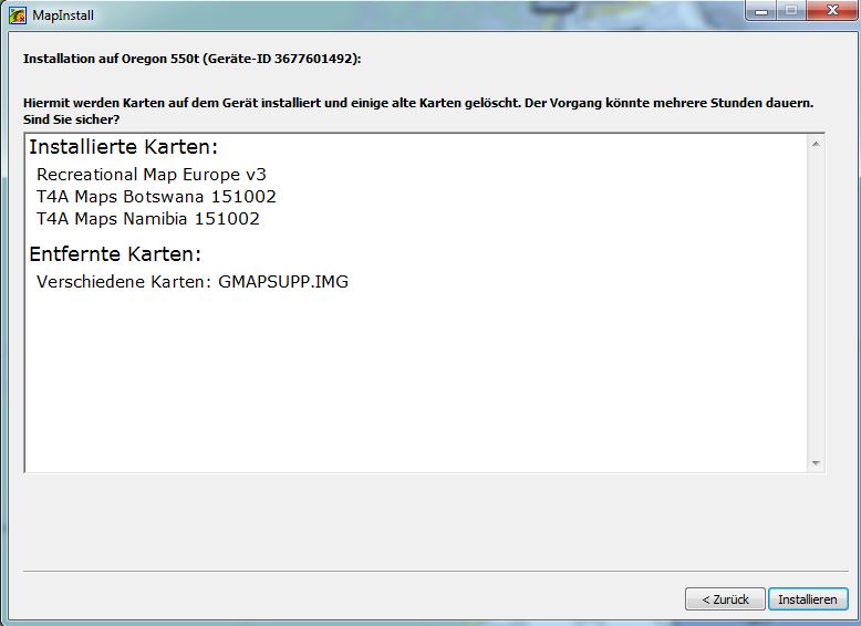 Startmenü MapInstall Beispiel: Installation von zwei Karten (Namibia und Botswana)Tracks4Africa MapInstall -Meldung vor der Installation Kontrolle per Windows Explorer